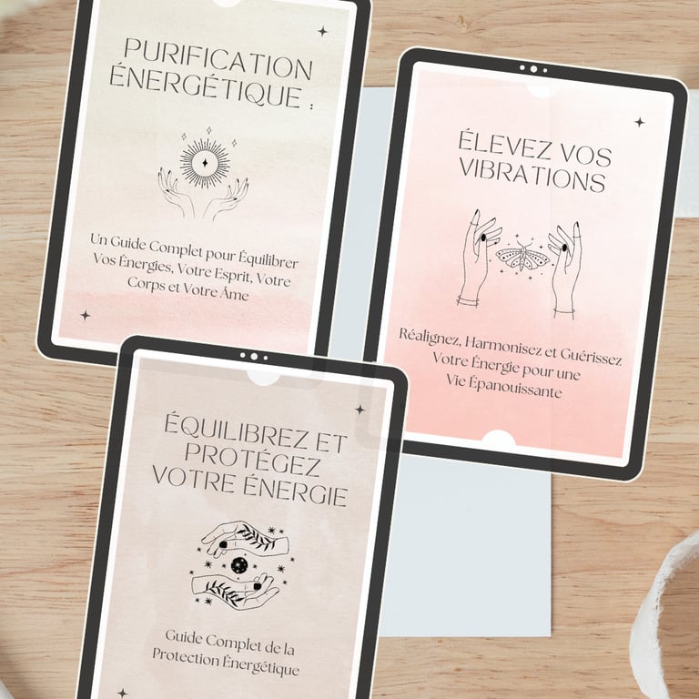 Des guides énergétiques complets PDF de plus de 300 pages qui regroupent des pratiques concrètes pour t’aider dans chacune des 3 étapes, de nombreux conseils et secrets pour prendre soin de toi et de tes énergies, et des connaissances énergétiques et spirituelles pour t’aider et t’accompagner dans ta vie